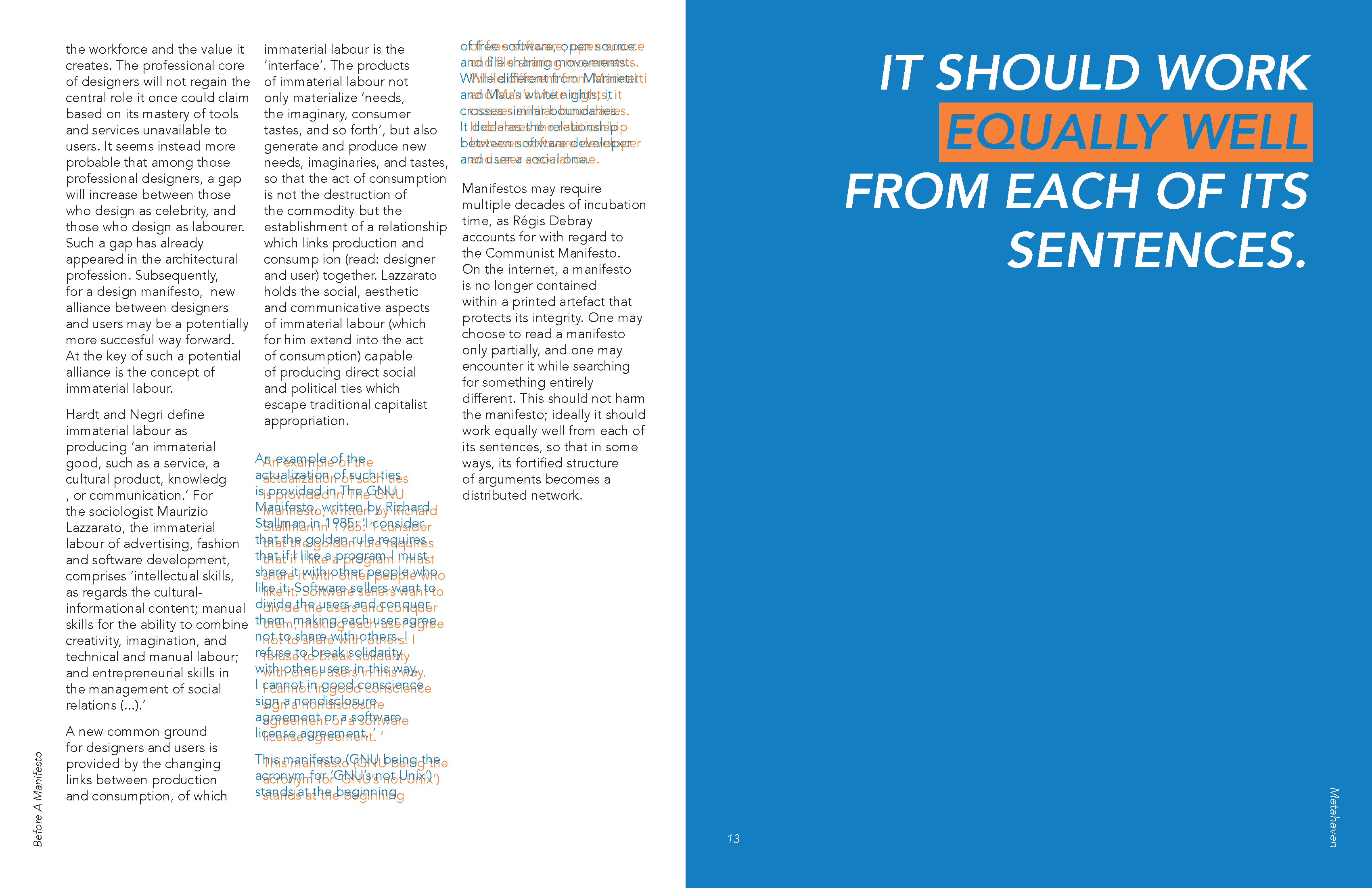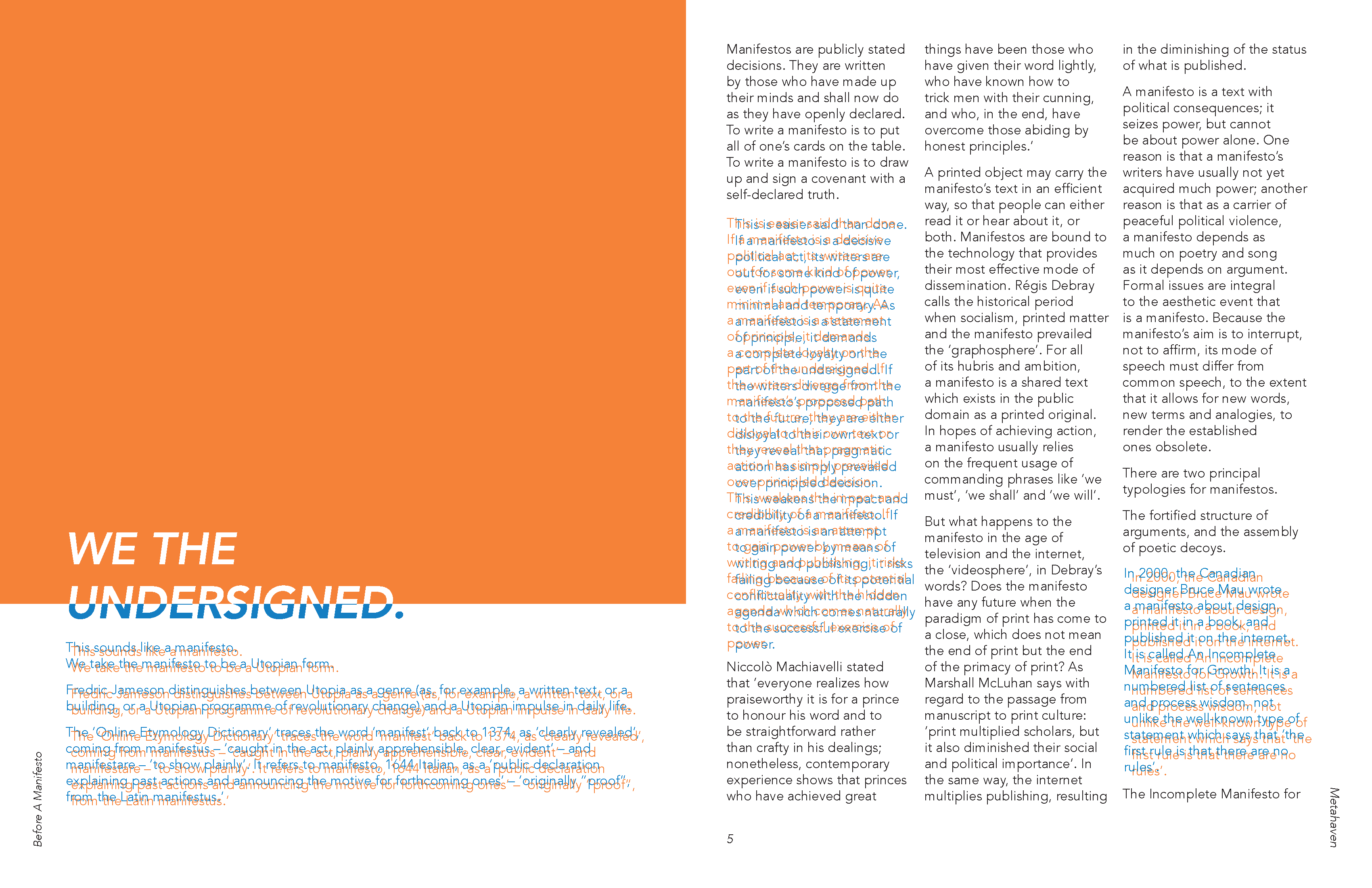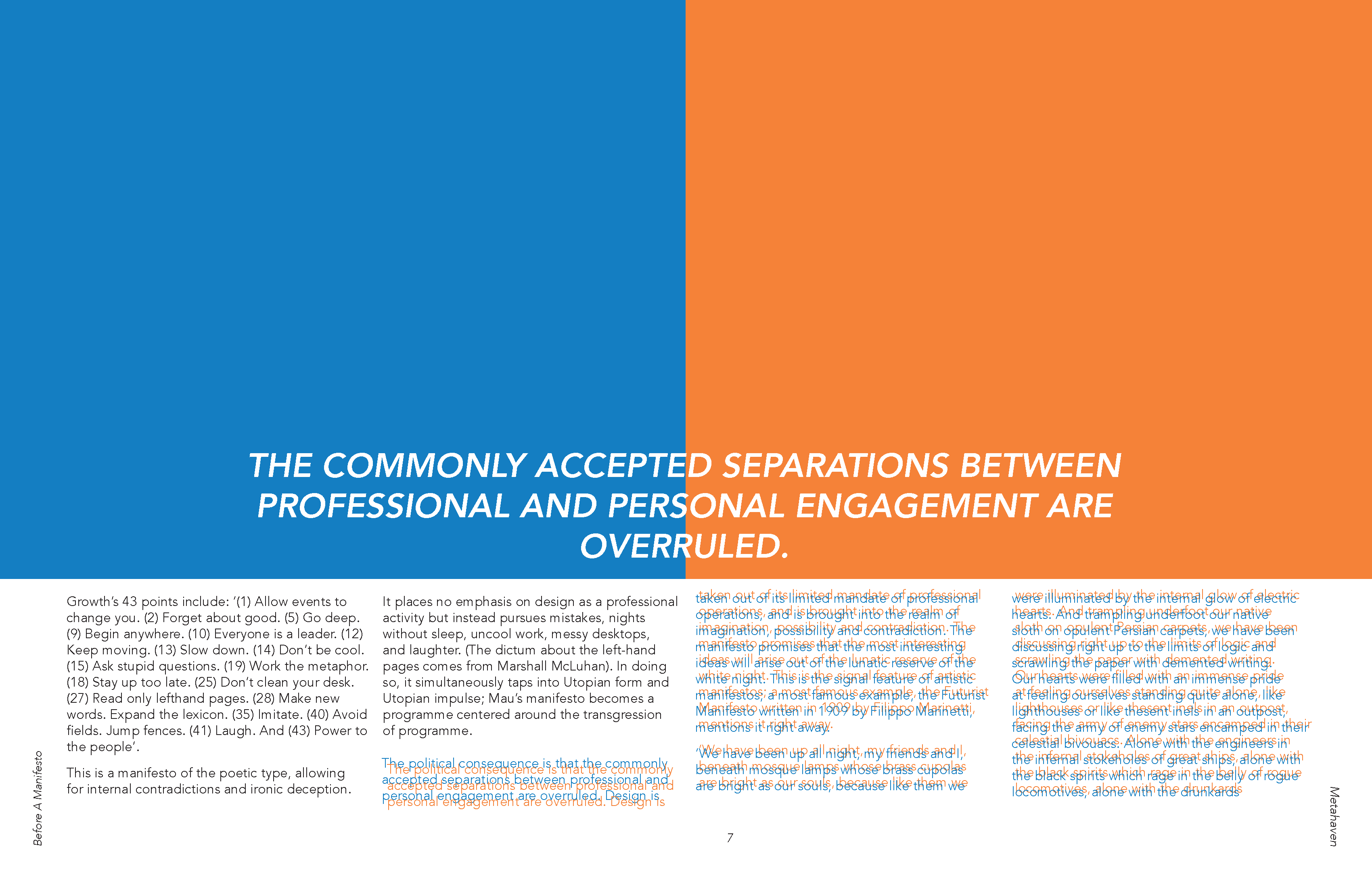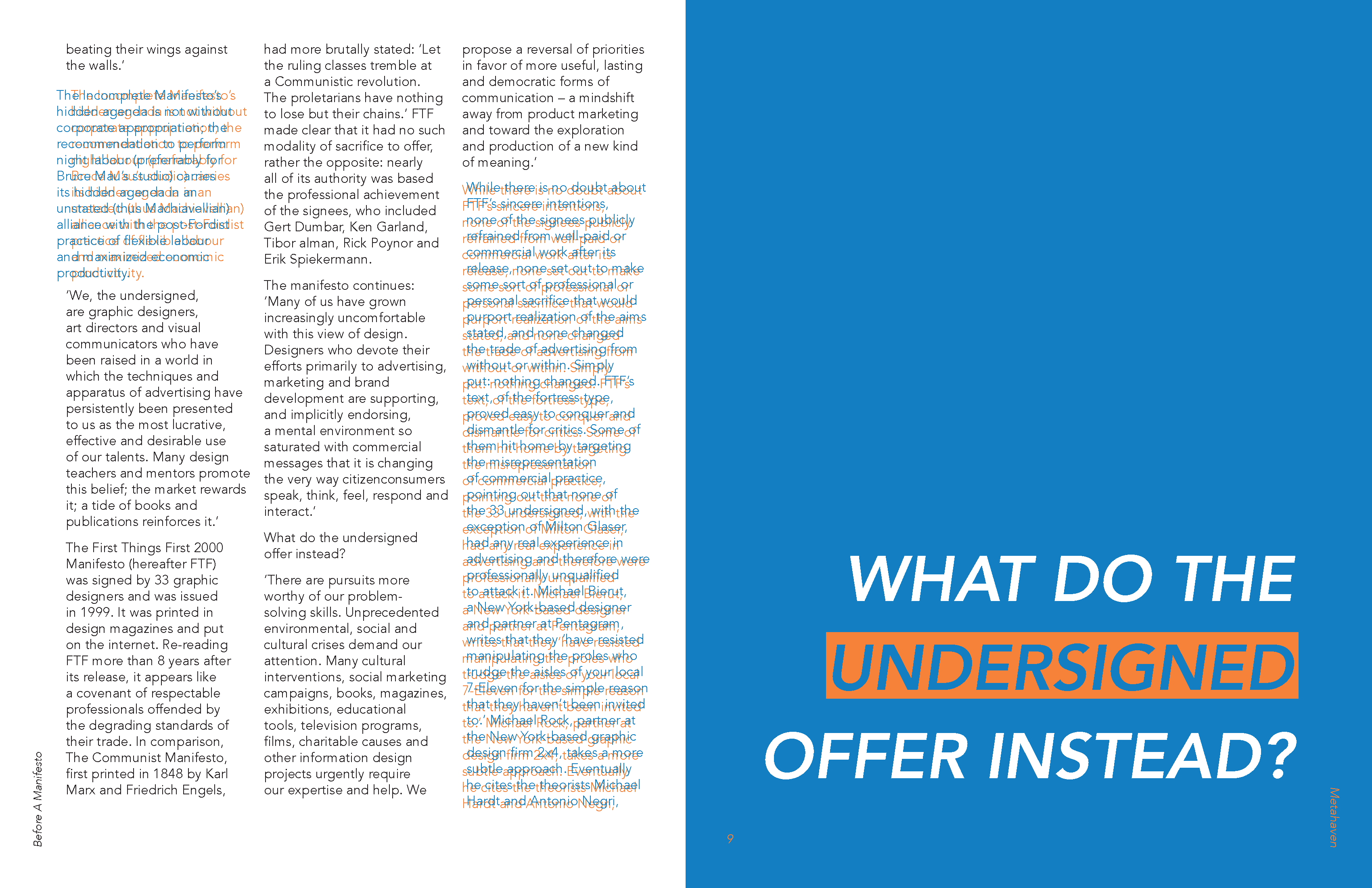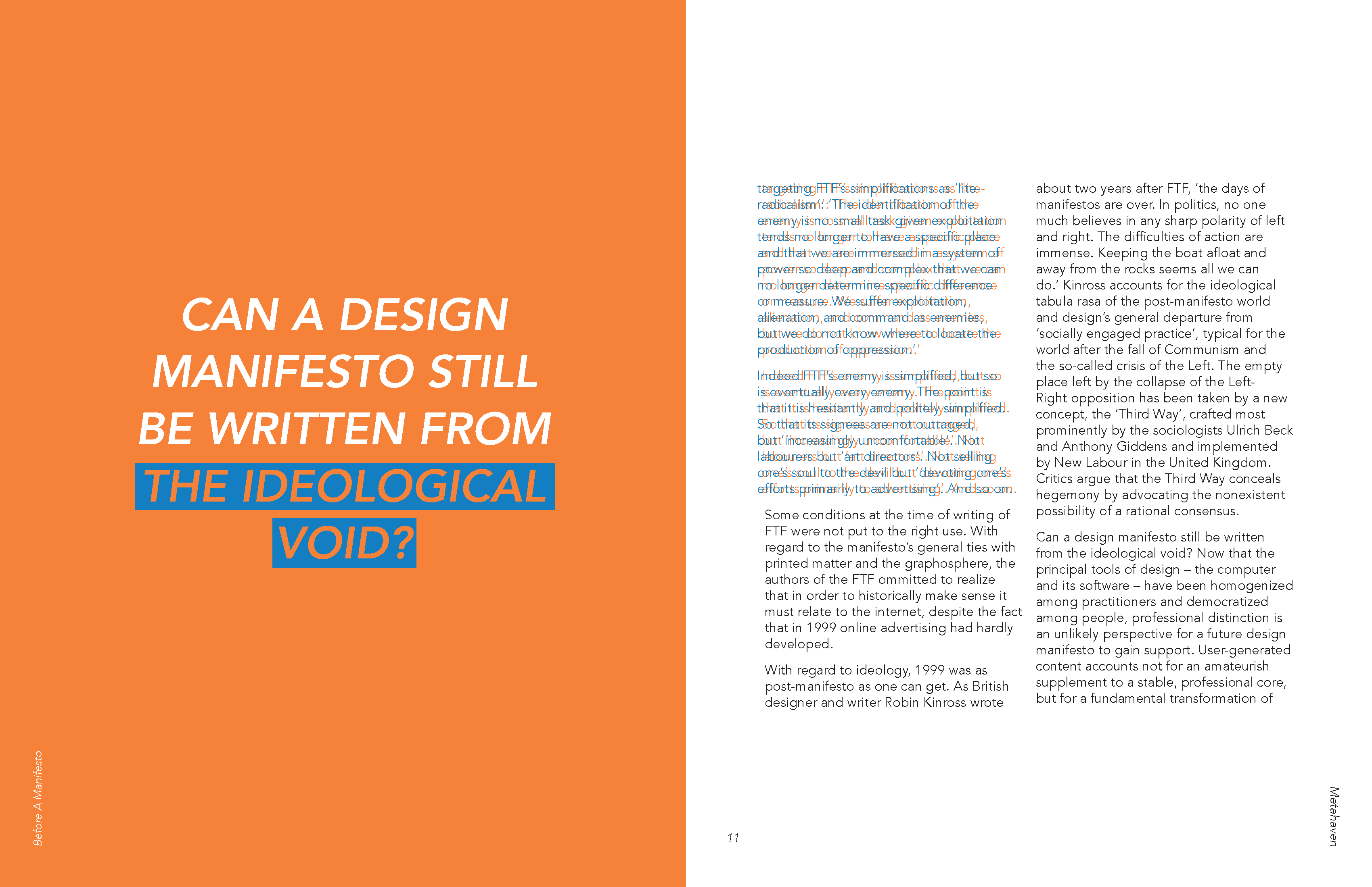 The irony of Metahaven’s critique on manifestos being a manifesto was something I found interesting. I decided to pull out things I thought were particularly important or interesting in their argument and make the rest of it difficult to read. It’s still readable but the simultaneous contrast between the blue and orange makes reading it uncomfortable, discouraging the viewer from actually reading the content.